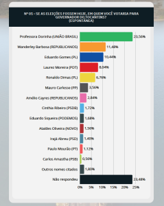 Na pesquisa espontânea, quando não são apresentados nomes de candidatos, a professora Dorinha (União Brasil) aparece com 23,56% das menções. Em seguida, vêm Wanderley Barbosa (Republicanos) com 11,48%, Eduardo Gomes (PL) com 10,44%, e Laurez Moreira (PDT) com 8,04%. Outros nomes somam índices menores, e 23,48% dos entrevistados não souberam ou preferiram não responder.