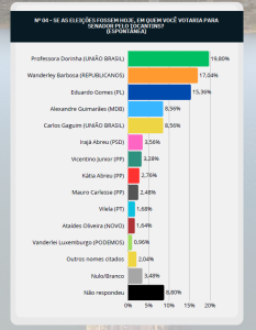 Na pesquisa e spontânea para o Senado, Dorinha (União Brasil) tem 19,80%, Wanderley Barbosa (Republicanos) surge com 17,04%, e Eduardo Gomes (PL) aparece com 15,36%.
