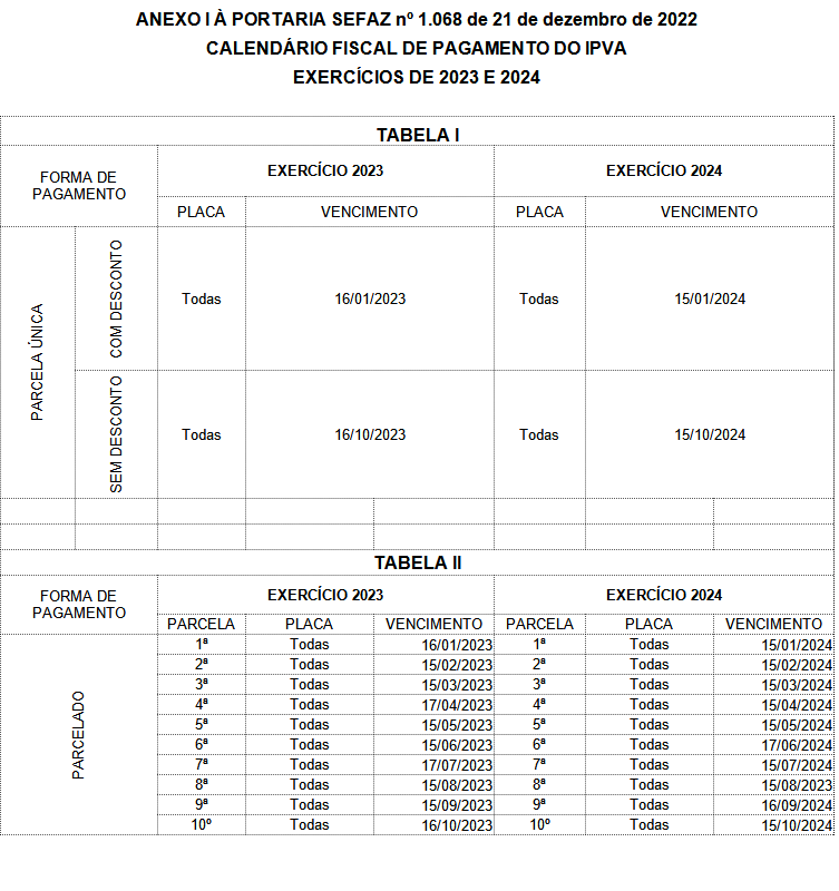 Conforme a Portaria, o contribuinte poderá pagar o IPVA 2023 em parcela única ou em até dez parcelas. Se a opção for por parcela única, quem efetuar o pagamento até o dia 16 de janeiro de 2023 terá desconto de 10%. Após esse prazo, o contribuinte terá até o dia 15 de outubro para pagar o IPVA 2021, mas sem o desconto.