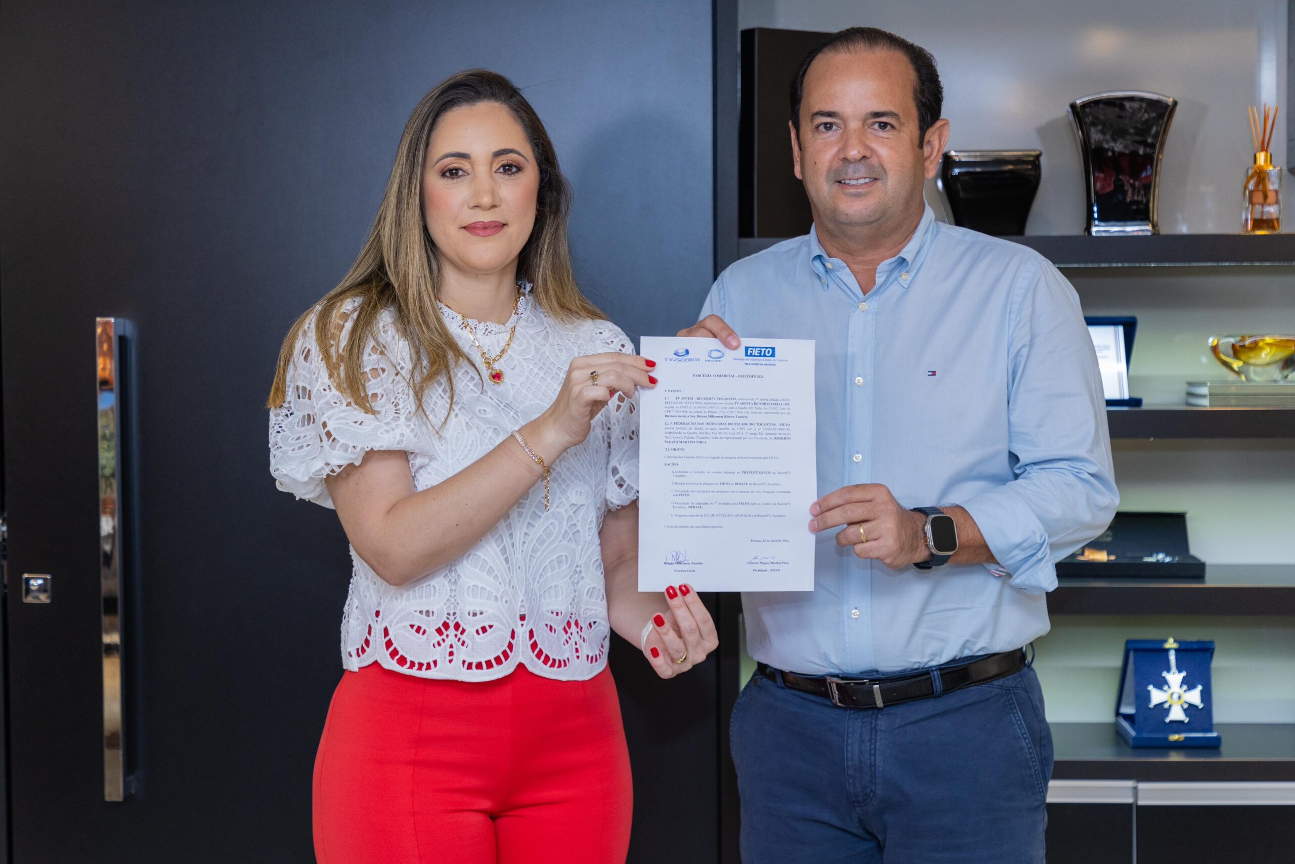 A Federação das Indústrias do Estado do Tocantins (FIETO) e a TV Jovem/Record Tocantins firmaram parceria nesta terça-feira, 23/04, para a divulgação da agenda de eventos das duas instituições com foco no processo eleitoral de 2024 em Palmas. A assinatura do termo foi feita pelo presidente da FIETO, Roberto Pires e a diretora da TV, Débora Tundela na sede da Federação.