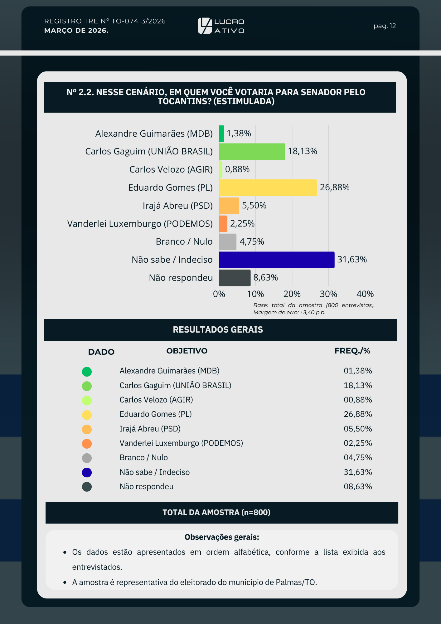 • Eduardo Gomes (PL) lidera com 26,88%