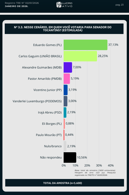 Já na simulação estimulada para o Senado — quando uma lista de possíveis candidatos é apresentada aos entrevistados — o levantamento revela Eduardo Gomes (PL) na liderança, com 37,13%, seguido por Carlos Gaguim (União Brasil), que atinge 28,25%, formando o principal eixo competitivo testado até o momento.