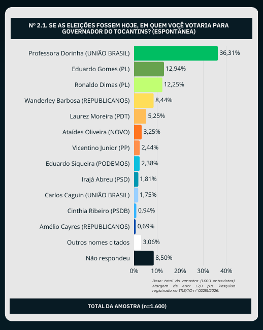 Na simulação espontânea para governador — quando o eleitor responde sem estímulo prévio de nomes — a pesquisa aponta a professora Dorinha (União Brasil) com 36,31% das menções, abrindo larga vantagem em relação aos demais concorrentes e demonstrando elevado grau de lembrança junto ao eleitorado neste início de ciclo.