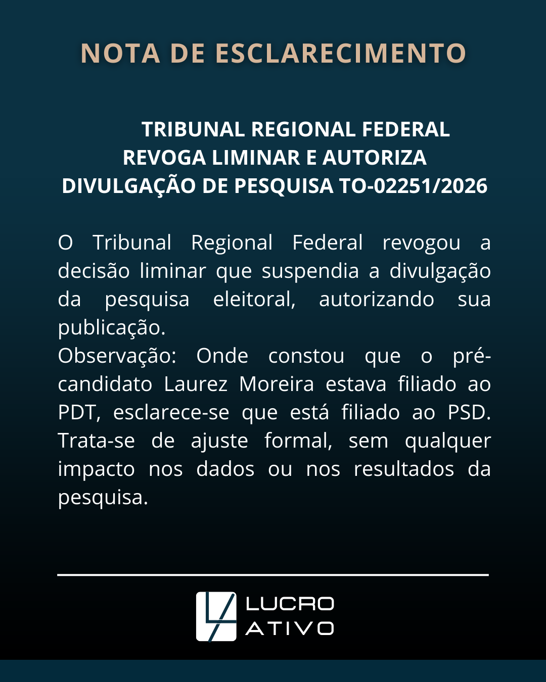 O levantamento foi realizado pela Lucro Ativo com recursos próprios e registrado junto à Justiça Eleitoral sob o número TRE/TO 02251/2026. A amostra foi estratificada por regiões e perfil sociodemográfico, com base em dados do TSE e do IBGE.